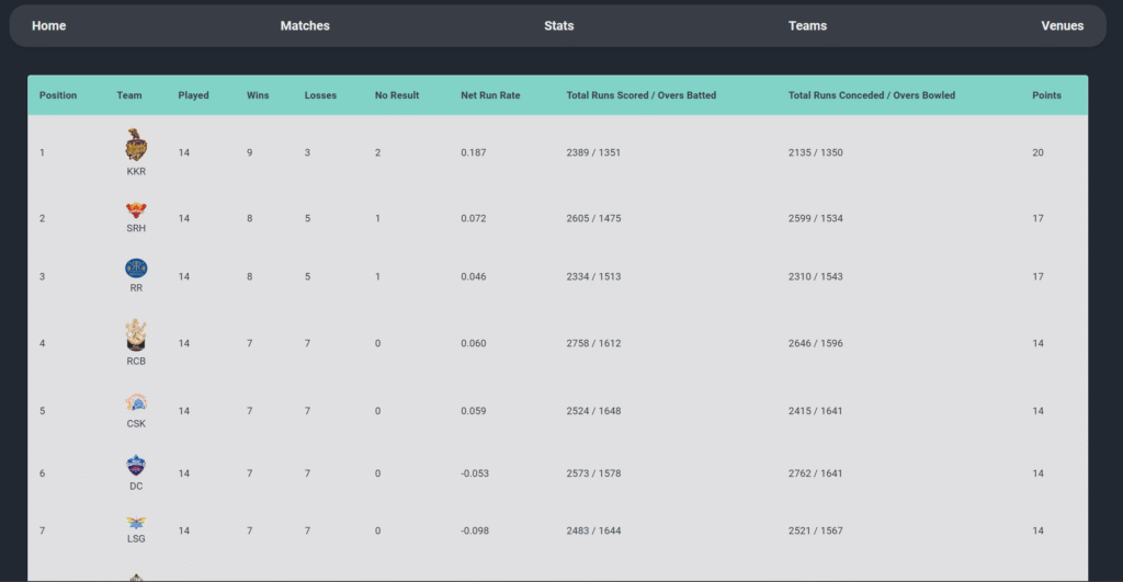 IPL 2024 Website built using Python, Next.js and a datasheet containing data and metadata of all the events that occurred in the IPL 2024 season.